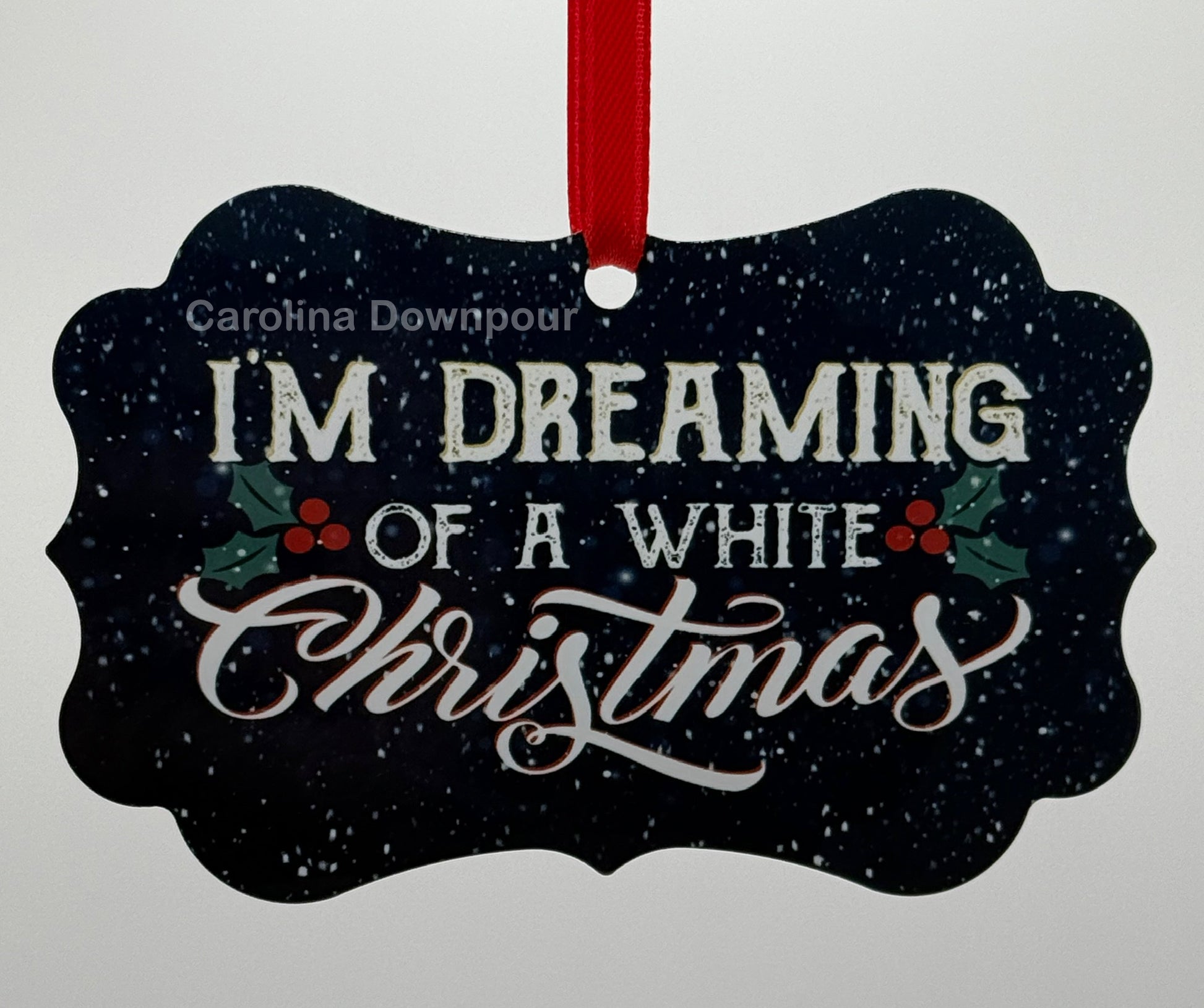 4 Inch Wide Benleaux Shape Metal Ornament on Red Ribbon. Double Sided Snowman W/Barn on one side, Words “I’m dreaming of a White Christmas”