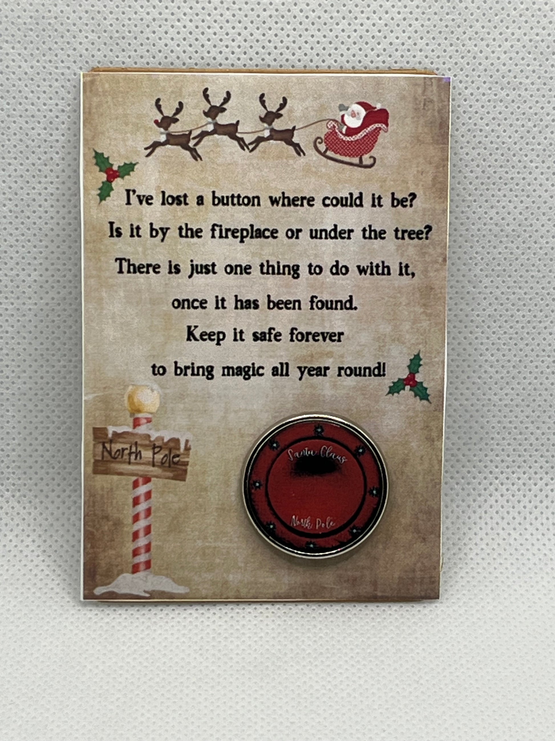 Something that is absolutely certain to become a instant classic for years to come! This set features a Lapel Pin replicating one of Santa’s Missing Buttons and a Special Note (attached to card) that magically appeared once it went missing!